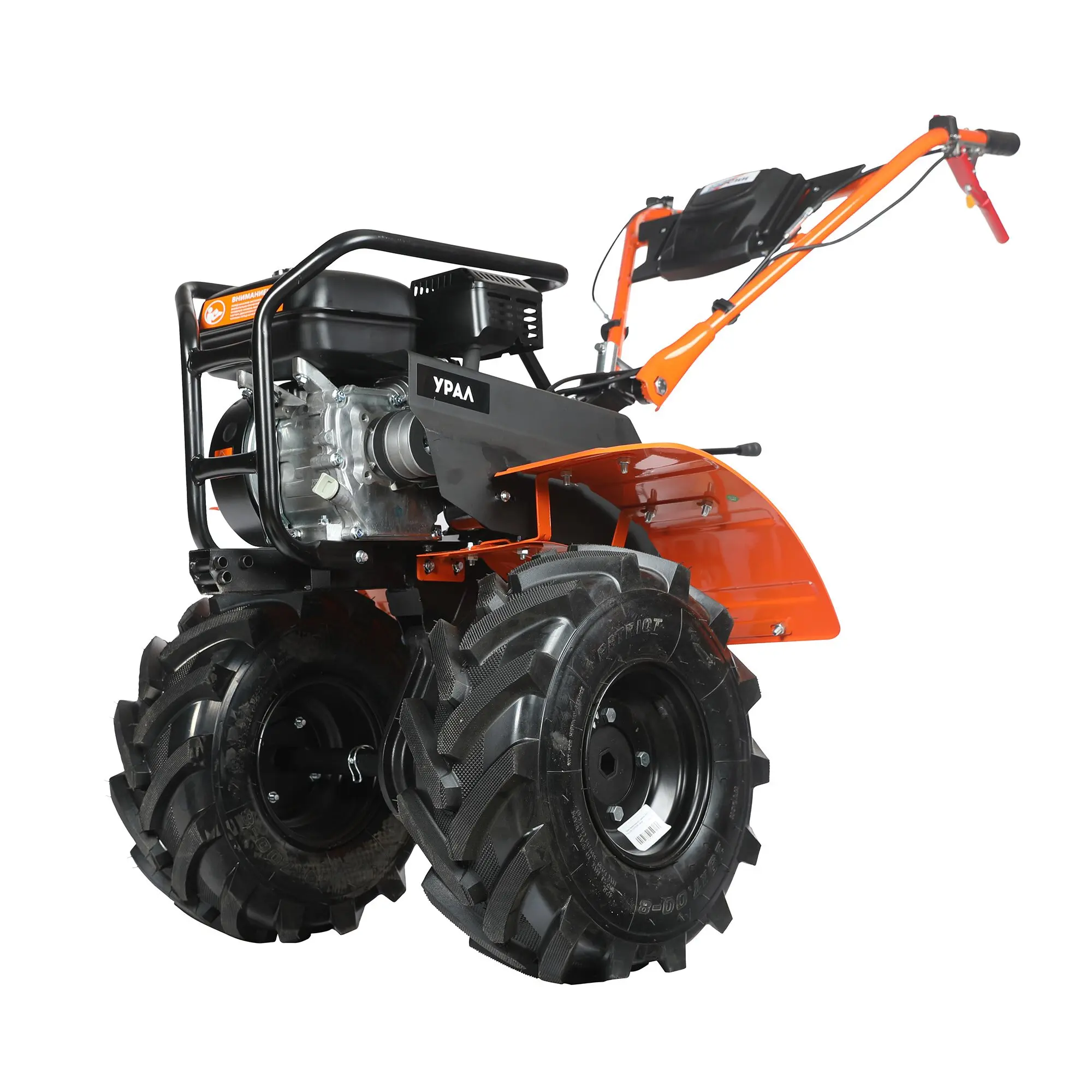 Урал - бензиновый мотоблок с 4-х тактным двигателем повышенного ресурса и цельнолитым чугунным цепным редуктором. Конструкция рамы облегчает транспортировку мотоблока и защищает двигатель, глушитель и бензобак. 4-х ступенчатая коробка передач. Перекидывание ремня между проточками трехручейкового шкива включает пониженную передачу. На сцепку устанавливается навесное оборудование или тележка. В комплекте закаленные фрезы, широкие колеса Extreme с глубоким протектором, сошник. Кнопка включения, рукоятка газа и рычаг привода расположены на руле. Наклон руля регулируется.