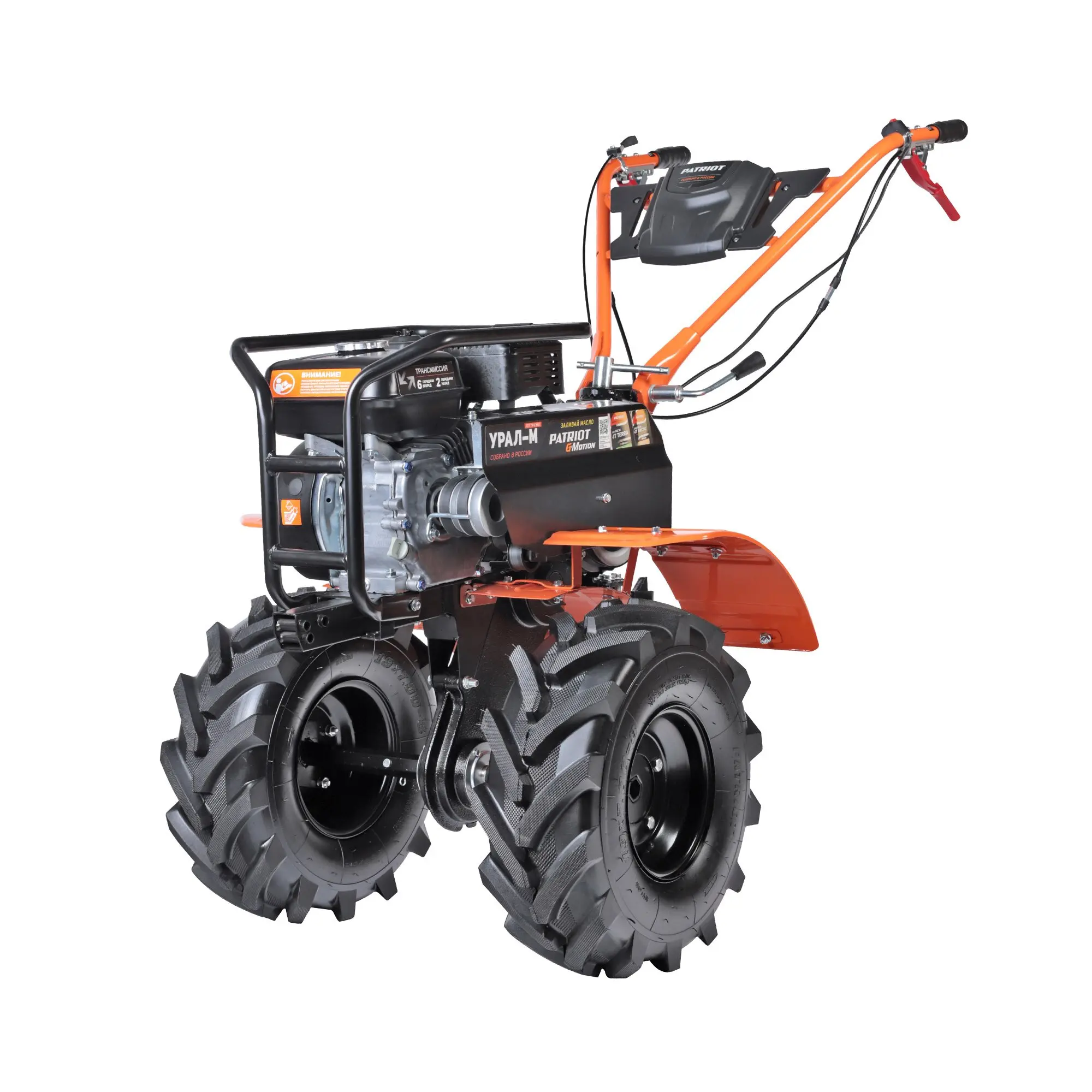 Урал М - бензиновый мотоблок повышенного ресурса с пониженной передачей и цельнолитым чугунным цепным редуктором. Конструкция рамы облегчает транспортировку мотоблока и защищает четырехтактный двигатель. Переключение скоростей осуществляется с помощью 6-и ступенчатой коробки передач с пониженной и повышенной передачами. На универсальную сцепку можно установить навесное оборудование или тележку. В комплекте закаленные фрезы, широкие колеса с глубоким протектором, сошник. Кнопка включения, рукоятка газа и рычаг привода расположены на руле. Наклон руля регулируется.