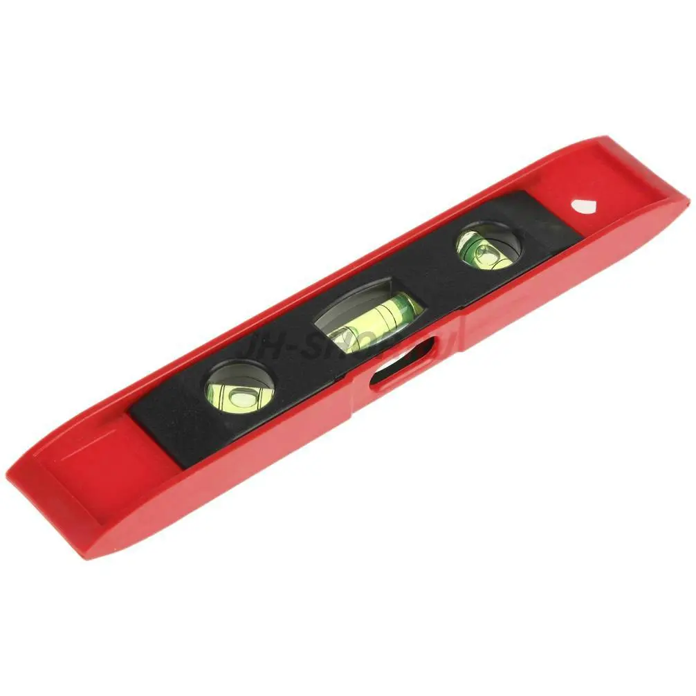 Корпус уровня изготовлен из ударопрочного ABS пластика. Инструмент имеет три мерительных глазка: для проверки отклонений по горизонтали, вертикали и под углом 45 градусов. Небольшой размер инструмента - 230 мм - позволяет работать в труднодоступных местах. Одна грань уровня намагничена, что позволяет использовать его на наклонных металлических поверхностях.