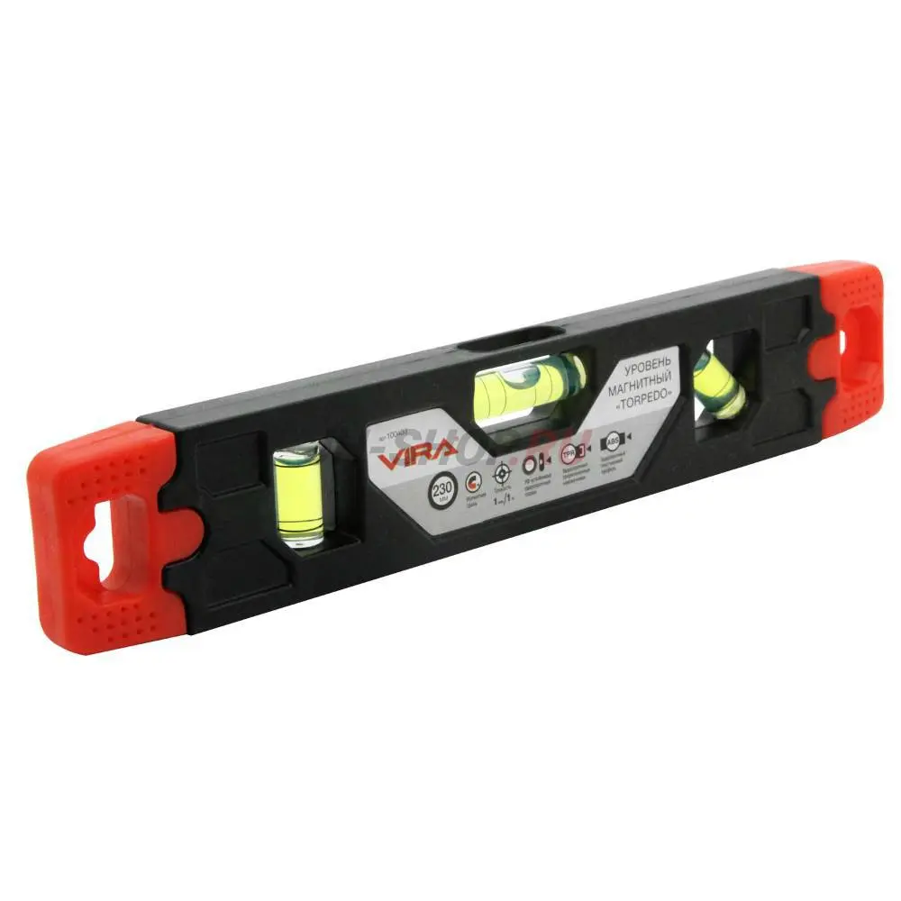 Уровень позволяет проверять горизонтальные, вертикальные поверхности, поверхности с уклоном 45 градусов на соответствие эталону. TORPEDO это самый компактный и легкий уровень в семействе VIRA. При длине 230 мм, вес инструмента – 75 грамм. Это легче вашего смартфона. Уровень создан для ношения с собой, его можно легко уместить в кармане куртки или сумке для документов. Легкость TORPEDO сочетается с прочностью. Корпус из ударостойкого ABS пластика позволяет ронять инструмент на твердую поверхность с высоты до 3 метров безо всяких опасений. Точность измерений при этом не сбивается. Дополнительную защиту при падении уровню придают прорезиненные наконечники на торцах. Точность инструмента 1мм/м. Позволяет работать на металлических поверхностях без помощи рук за счет магнитной грани по всей длине профиля.