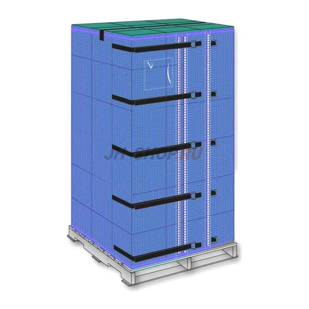 Система крепления груза FROSTWALL уменьшает использование стрейч-пленки и термоусадочной упаковки, снижает расходы на утилизацию упаковочных материалов, экономит время упаковки и распаковки поддонов. Система вентилируется, уменьшает порчу продуктов, а также подходит для многоразового использования.