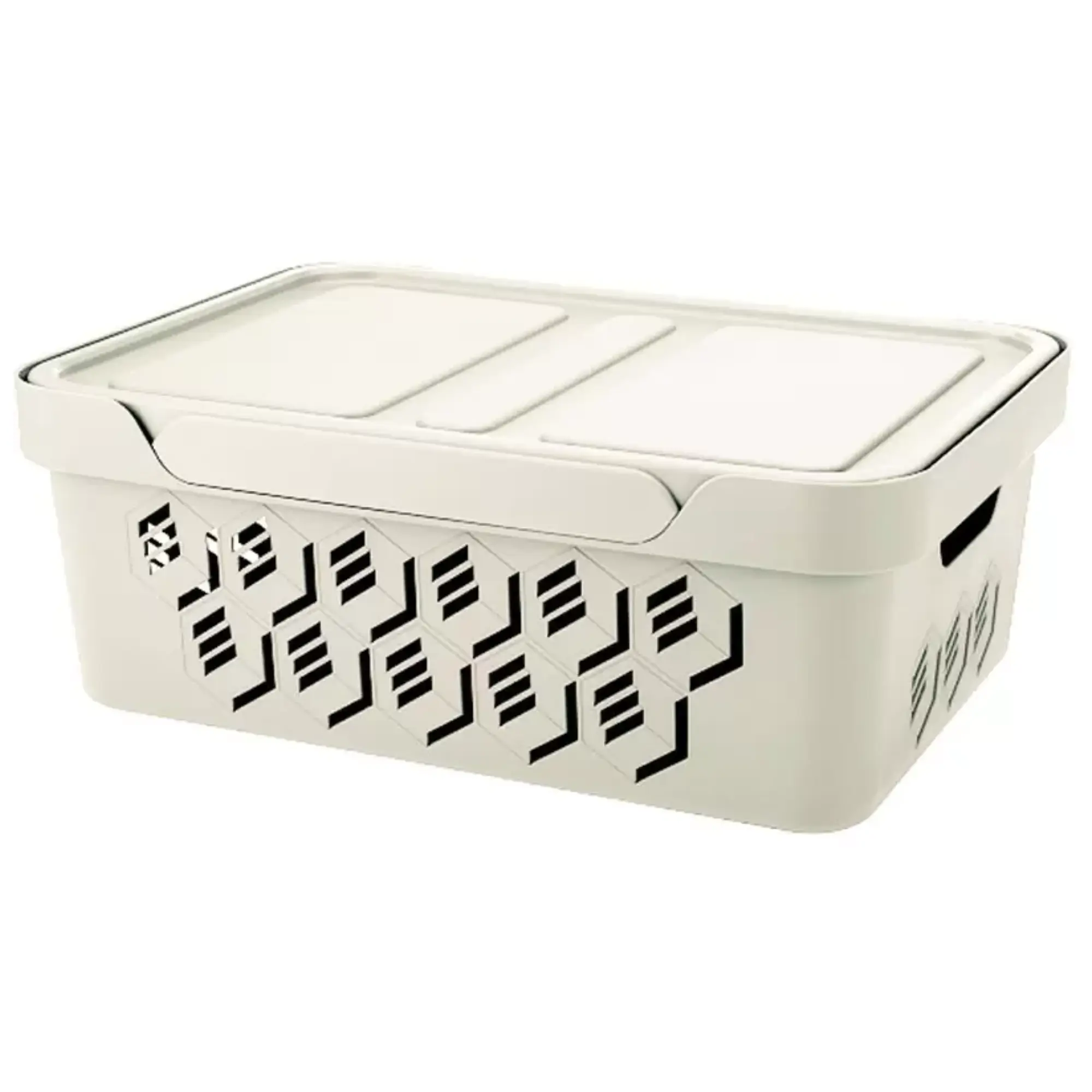 Ящик предназначен специально для хранения на открытых полках и стеллажах. Штабелируется со всей линейкой ящиков Deluxe и Luxe. Ящик с удобными ручками, гладким дном, геометрическими узорами и перфорацией на корпусе. Подойдет для хранения игрушек, документов, текстиля, товаров для творчества. Крышку ящика можно перевернуть, и она превратится в удобную полочку для хранения мелочей.
