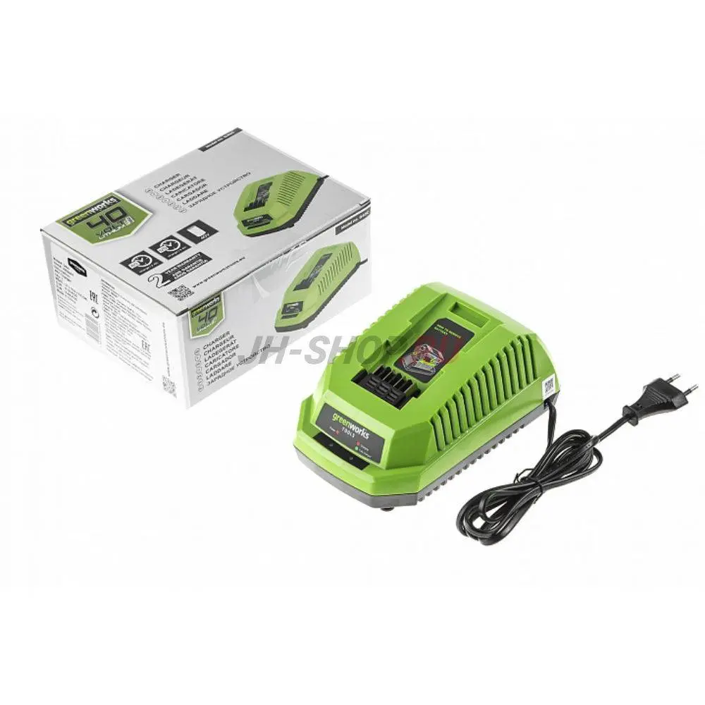 Зарядное устройство Greenworks 40V G40UC. Предназначено для зарядки литий-ионных аккумуляторных батарей серии Greenworks 40V. Данная модель обладает индикатором уровня заряда и системой защиты от перезаряда аккумулятора. При достижении 100% заряда питание автоматически отключается. Снабжено перфорацией для защиты от перегрева и прорезиненными ножками для устойчивости на плоскости. Предусмотрены проушины для крепления на стену.
