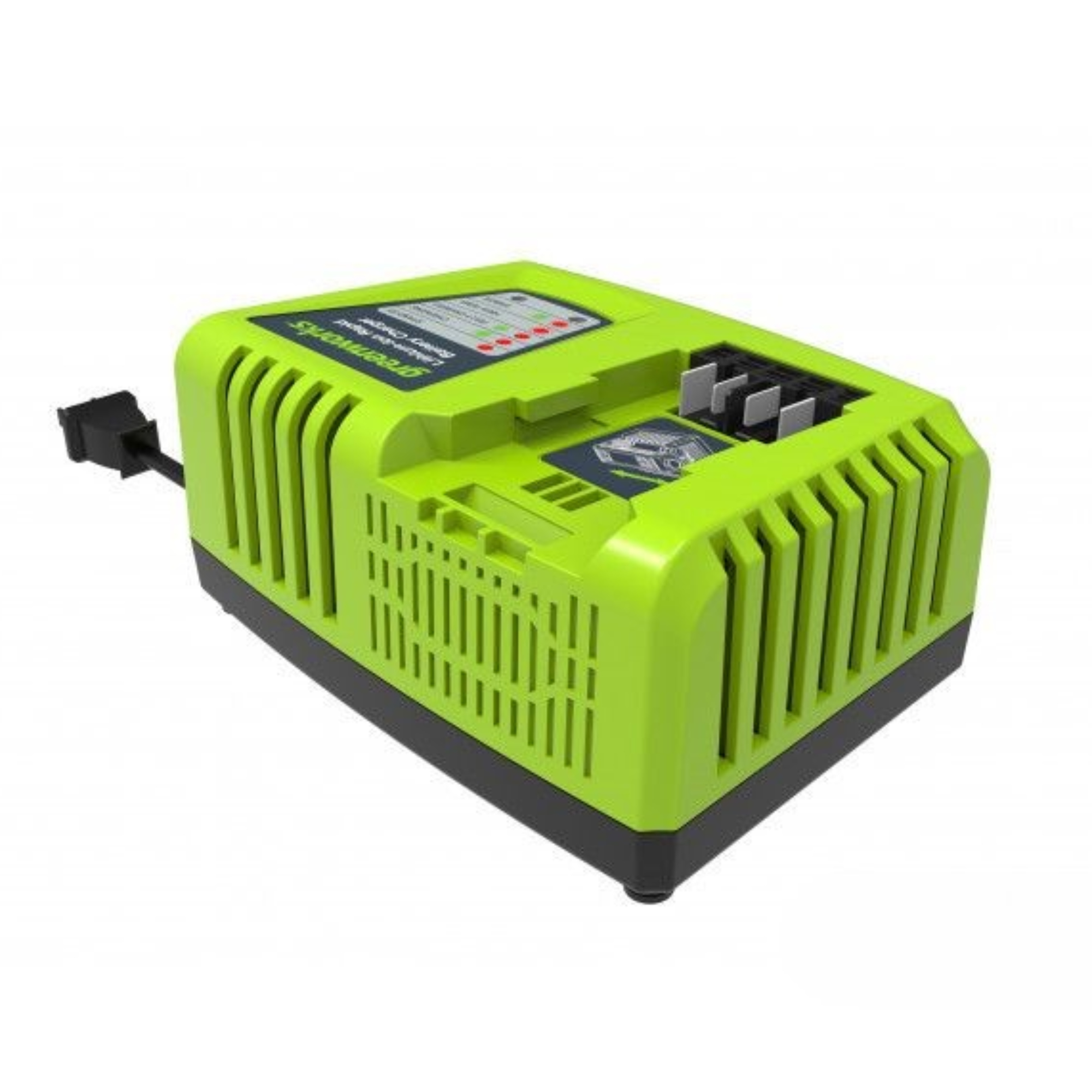 Быстрое зарядное устройство Greenworks G40UC4 - это компактное оборудование, используемое для быстрой подзарядки аккумуляторов электроинструментов. Представленная модель, облаченная в прочный пластиковый корпус черно-зеленого цвета, предназначена для пополнения заряда литий-ионных АКБ. Длительный срок службы зарядного устройства обеспечен интегрированной системой защиты от перезаряда: при достижении аккумулятором 100-процентной емкости зарядка автоматически прекращается. Устойчивости оборудования на любой горизонтальной поверхности способствуют прорезиненные ножки.